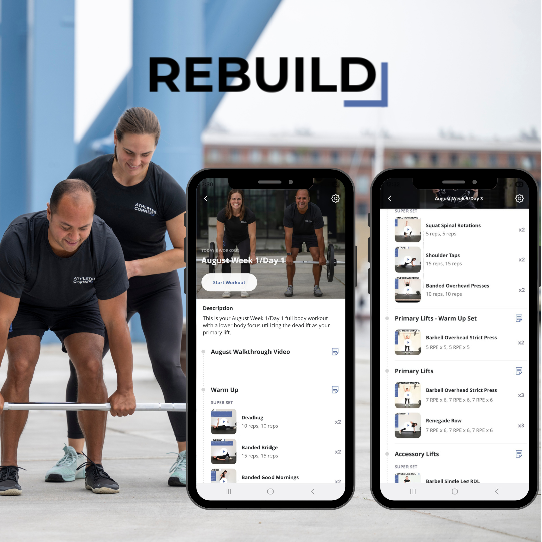 All Rebuild programs are completely customized to your goals, needs and availability. We can program workouts anywhere for 10 minutes – 2 hours and beyond, we will account for your goals and develop a program that will help you achieve and maybe even surpass them! During this process you will continue to have access to your coach via a messaging system, where any adjustments can quickly be made to your program.